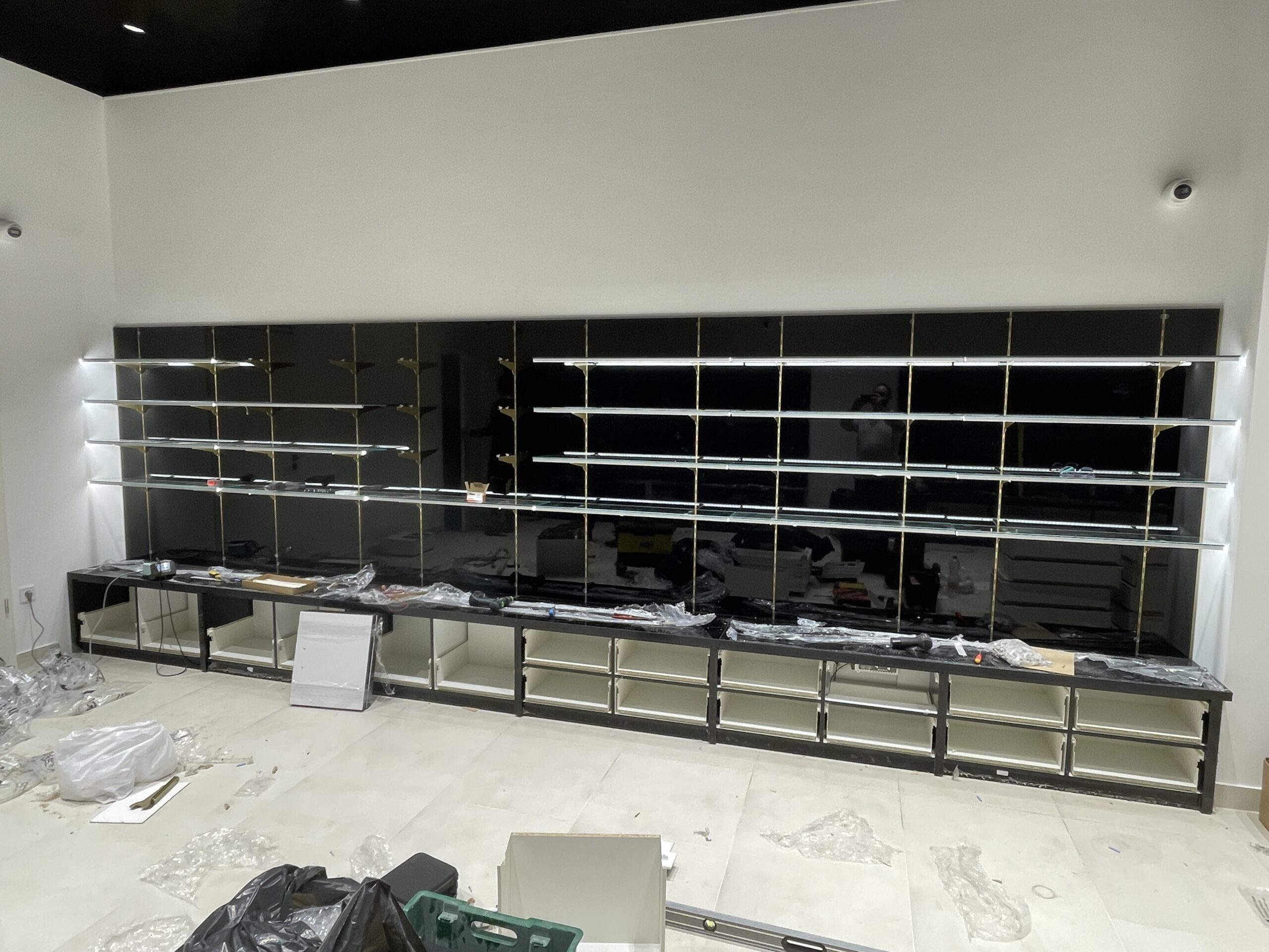 A modern üzletberendezési trendeknek megfelelően minden polc külön LED világítást kapott. Ez a megoldás nemcsak funkcionális – hiszen tökéletes láthatóságot biztosít –, hanem erőteljes vizuális eszköz is. A finoman irányított fények kiemelik a termékek formáját, színét, textúráját, miközben dinamikát adnak az egész térnek. A fekete felületekkel kombinálva a világítás szinte „lebegteti” a termékeket, ezzel erősítve a prémium élményt.